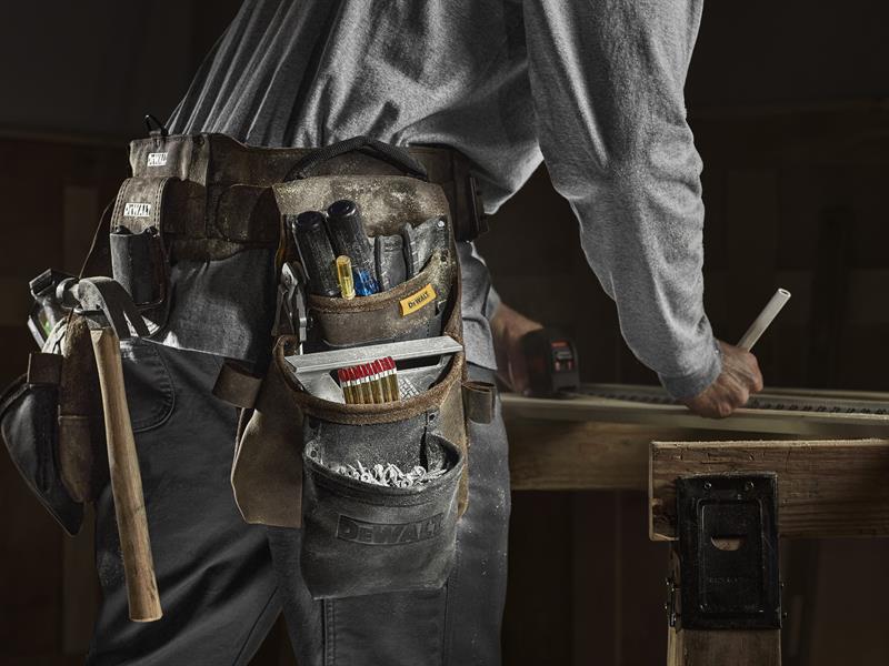 DEWALT DWST50113 Pro Leather Tool Rig with various pockets, tape measure pocket, external screwdriver holders and metal hammer loop. Made from premium nubuck top grain leather. Riveted at stress points for increased durability.