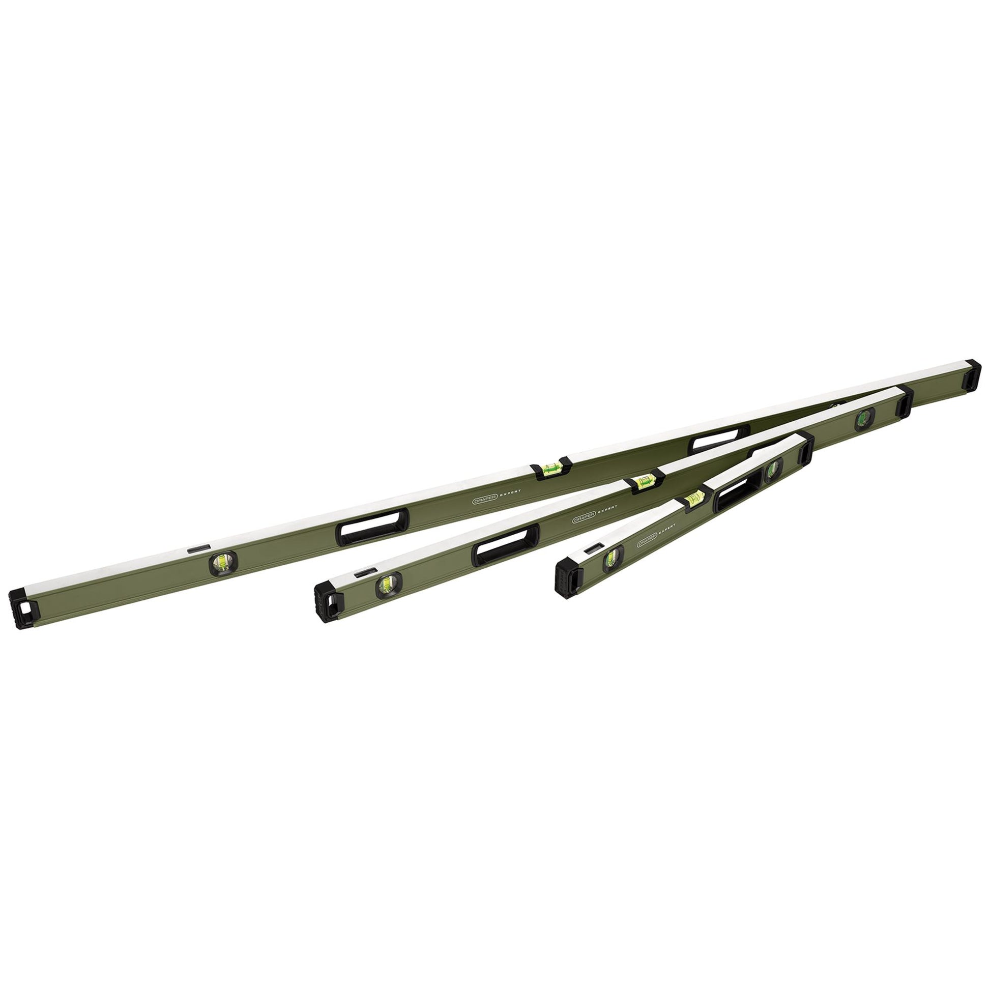 This set includes 600mm, 1200mm, and 1800mm professional heavy-duty box spirit levels. Each is made from aluminium and has three vials. They feature a milled top and bottom surface for maximum stability and precise accuracy. The levels have a 180° domed/arc center vial and two 90° vials. The vials are UV and shock-resistant, and the embossed rubber end caps provide added protection. For ease of use and portability, they include an integrated anti-slip handle. Hang holes are available for convenient storage at both ends. The accuracy is 0.5mm in a standard working position. These levels are supplied inside a strong padded bag with a handle and three storage pockets.