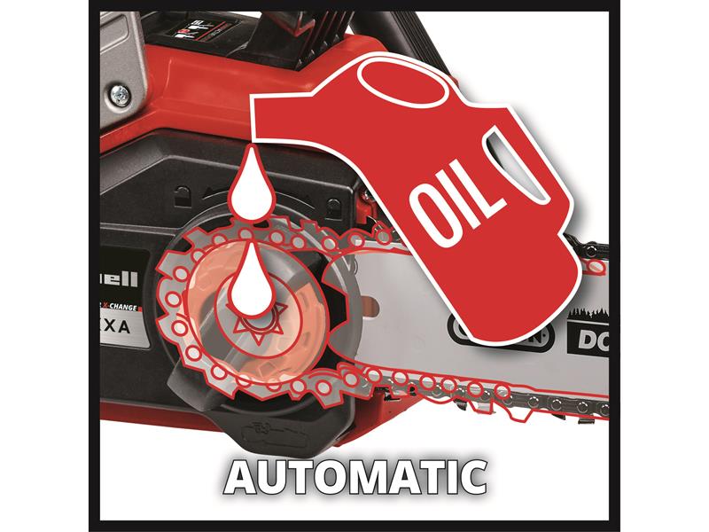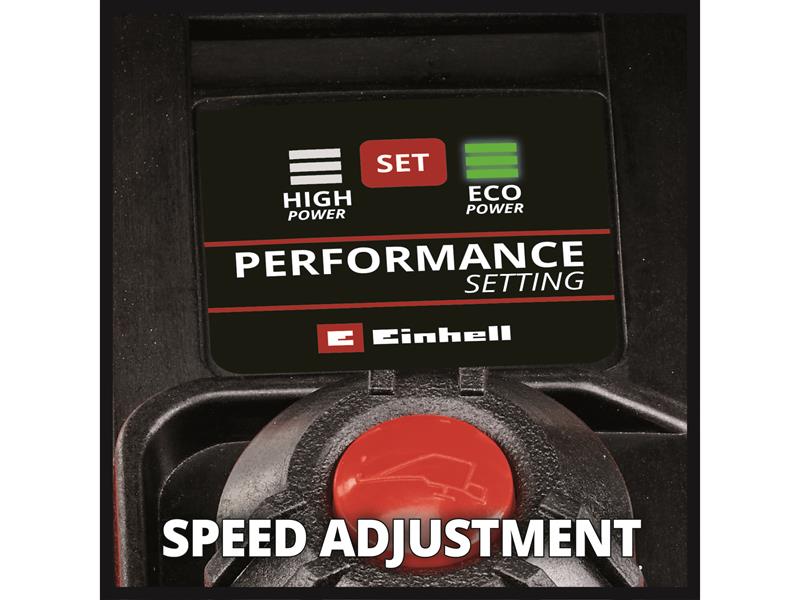 The Einhell FORTEXXA 18/30 Power X-Change Chainsaw is powered by the Einhell PurePOWER brushless motor. This brushless motor offers more power and a longer running time than conventional carbon brush motors. After registering online, the brushless motor comes with a 10-year warranty. The chain speed is adjustable depending on the application, i.e. it is possible to switch between full power (8 m/s) and Eco mode (6 m/s). With the reduced chain speed, the battery life is extended.