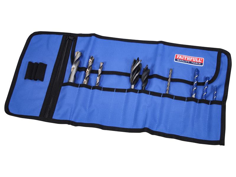 Contains pockets for various sizes of drill bits and a zip-up compartment for storing small tools or paperwork. Three elastic loops are provided for secure pen or pencil storage.