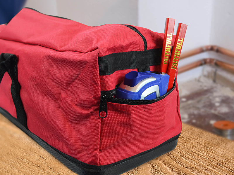 This Faithfull Zip Top Holdall is made from heavy-duty polyester with a reinforced backing and heavy-duty zip fastener. Wide opening for easy access. The PVC hard bottom base is waterproof.