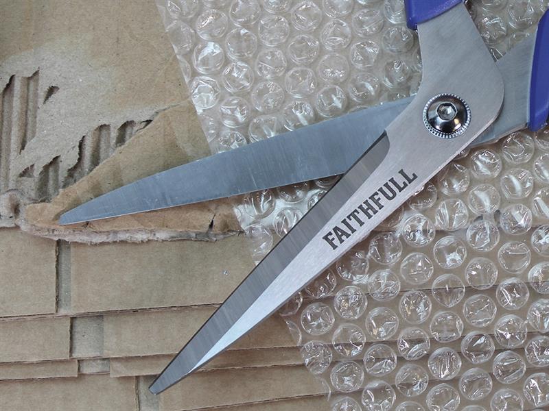 Faithfull Heavy-Duty Scissors feature stainless steel blades with iron carbide cutting edges for superior durability. Iron carbide cutting edges stay sharper for longer than traditional stainless steel edges. Bolt lock technology keeps the blades from loosening and ensures a precise cutting action. An all-metal core adds extra strength and prevents handle breakage if the scissors are dropped.
