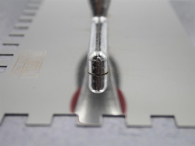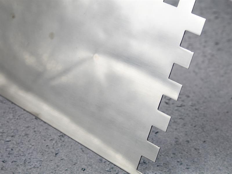 Stainless steel notched blade for applying wall tile adhesive. Two straight edges for finishing and cutting off.