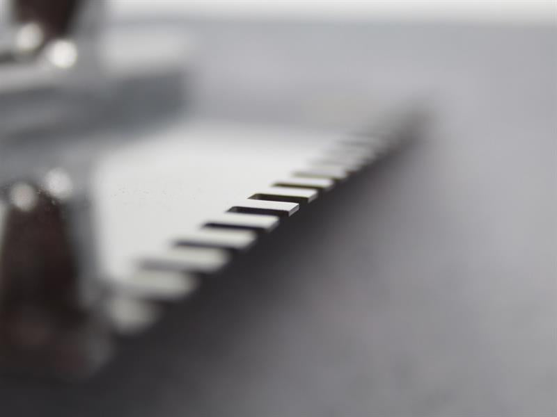 Stainless steel notched blade for applying wall tile adhesive. Two straight edges for finishing and cutting off.