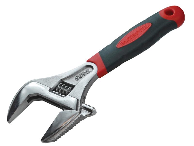 Faithfull Adjustable Spanner with a wide opening and a reversible jaw with serrated edge. Made from chrome vanadium with soft-grip handle for comfort.