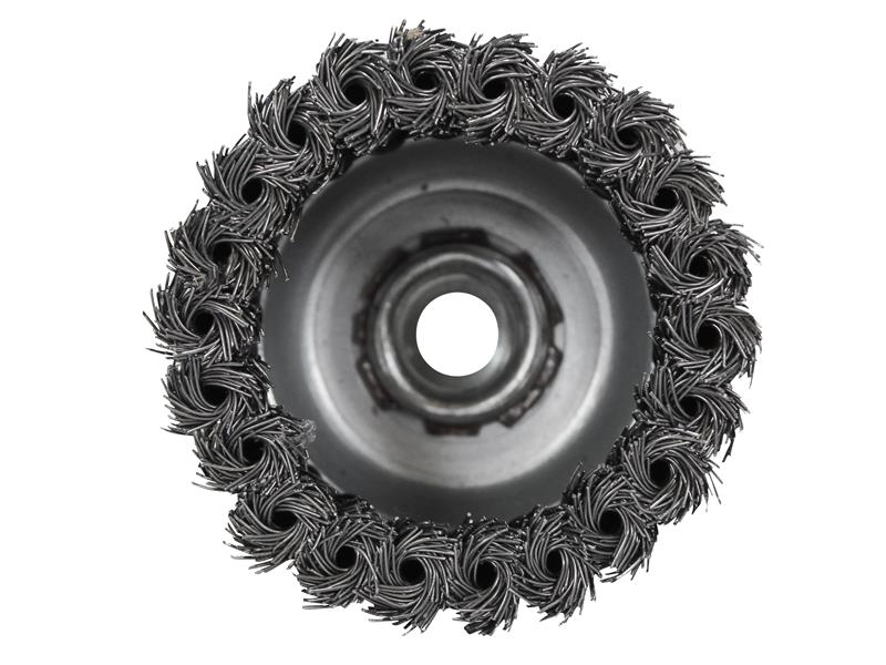 Faithfull Twist Knot Wire Cup Brush for heavier duty applications such as the removal of slag, rust, scale or even dried concrete. Designed for use with a compatible thread angle grinder.