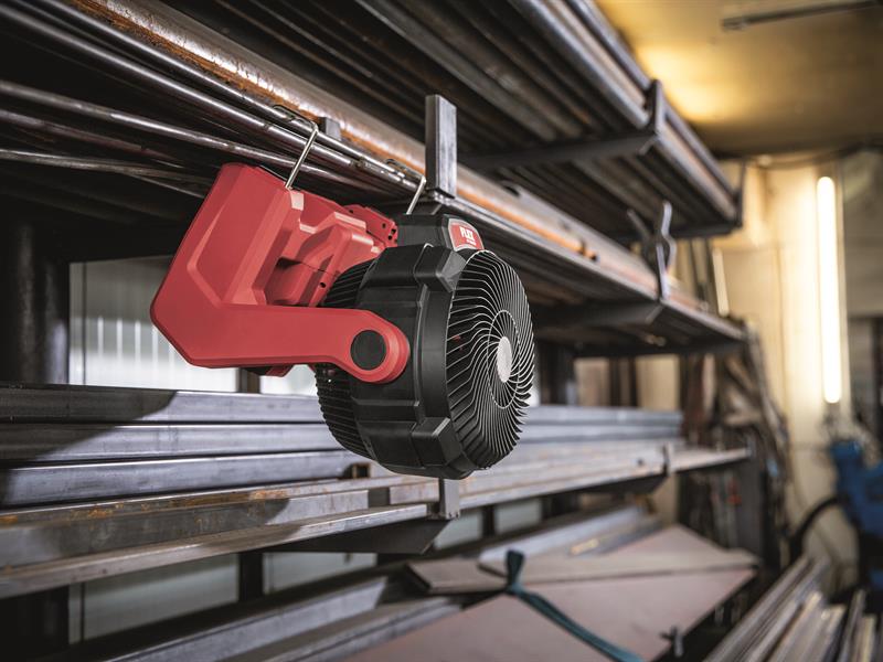The Flex Power Tools CF 18.0/230 Fan can run on an 18V Li-ion slide-type battery or via the 230V power supply unit. An electronic management system (EMS) protects the machine, extends the service life and increases efficiency. With stepless air volume regulation and a soft start feature. Can be used in a variety of ways; hook, a 1/4in and 5/8in mount, and a head that can be swivelled through 180°.