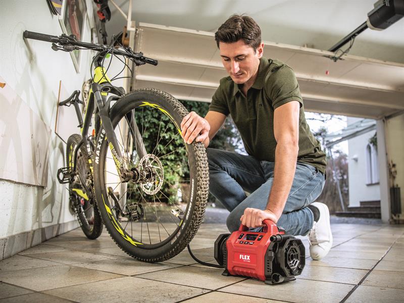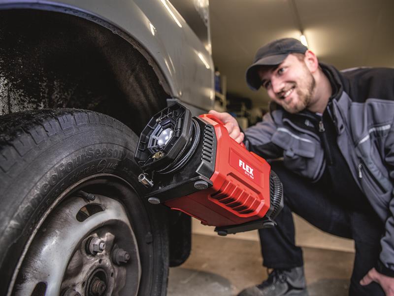 The Flex Power Tools CI 11 18.0 Inflator is suitable for high-pressure and large volumes, e.g., filling and emptying of air mattresses and other large-volume objects. Can be powered by a Flex 18V slide-type Li-ion battery (NOT supplied) or 12V vehicle voltage (via cigarette adaptor). Clear, large operating elements for fast setting of the desired functions. It also features pressure presetting with automatic switch-off when the desired pressure is reached.