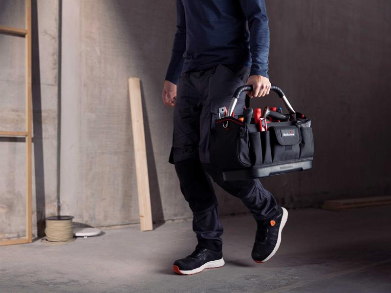 The Hultafors Ergonomic Tool Carrier has been specially designed with a curved back for easier carrying on and off-site. A higher back supports more tools, with a lower front for easy access with a clear overview of the contents. It features 25 pockets and tool holders, including a securely zippered pocket on the side and a clip for measuring tapes.
