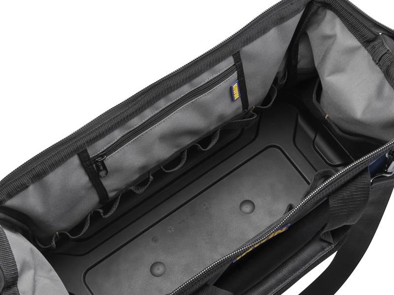 The IRWIN® Large Open Mouth Bag is made from strong, 600 denier fabric that resists wear and tear for lasting durability. Its open-mouth structure enables easy access to tools. With multiple internal and external pockets for maximum organisation. A hard-wearing plastic bottom provides maximum protection from moisture and dirt. It has padded handles and an adjustable shoulder strap for easy carriage of tools.