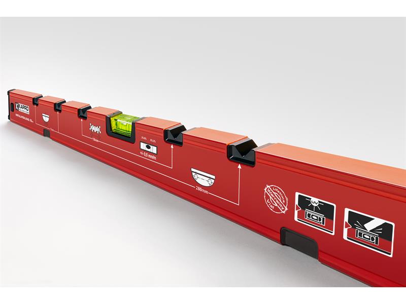 This level has markers on the profile at standard sink installation points: 280mm for sink attachment to wall, 150mm for tap placement and 75mm for water pipes below the sink. The level has shock absorbing rubber end caps on either end to prevent the level from getting damaged if it is dropped. Kapro's wall grip feature allows you to keep the level against a flat surface with one hand without scratching or damaging the wall.
