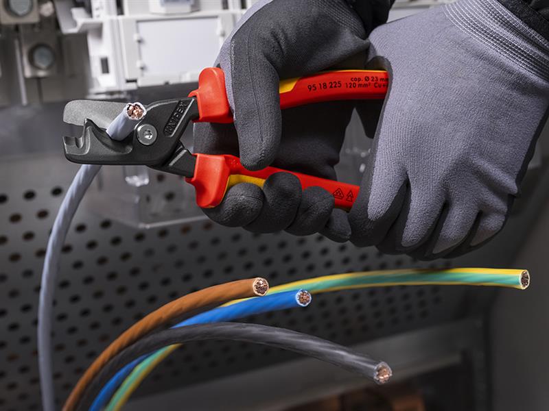 They offer easy one or two-handed operation with minimum handle opening for large cable diameters. The adjustable, high-leverage bolted joint provides precise and smooth cutting. Fitted with VDE multi-component grip. VDE tested up to 10,000V and safe for work up to 1,000V. They conform to DIN EN / IEC 60900. A pinch guard prevents operators' fingers being pinched.