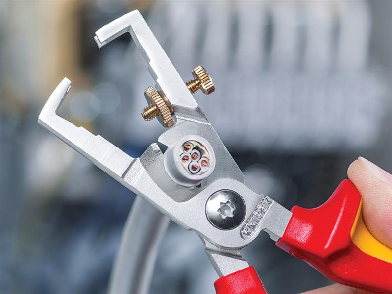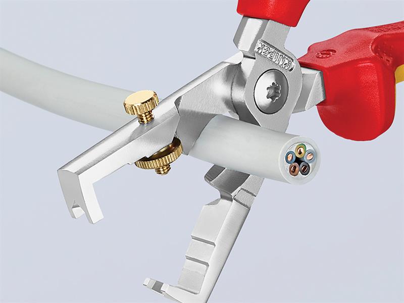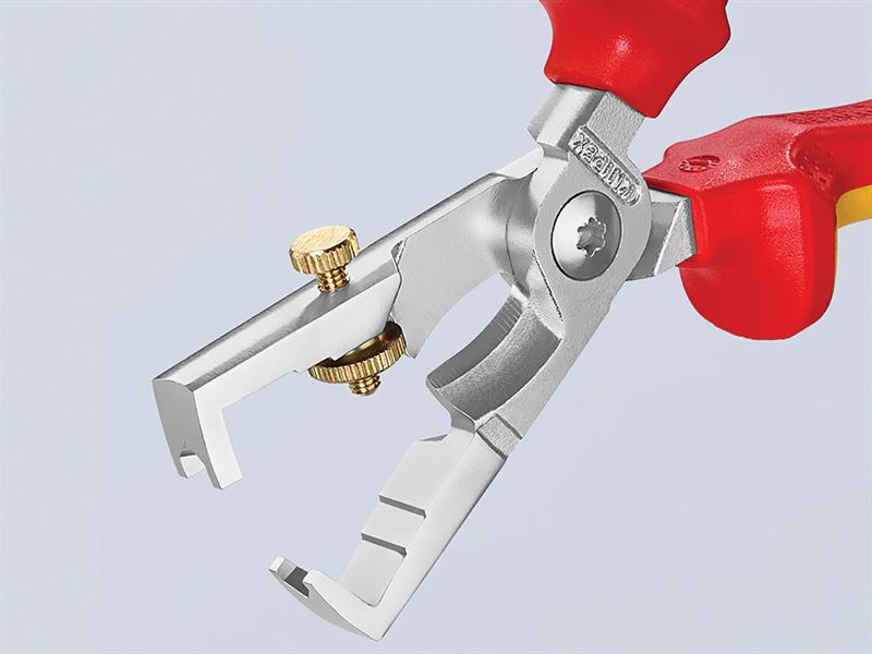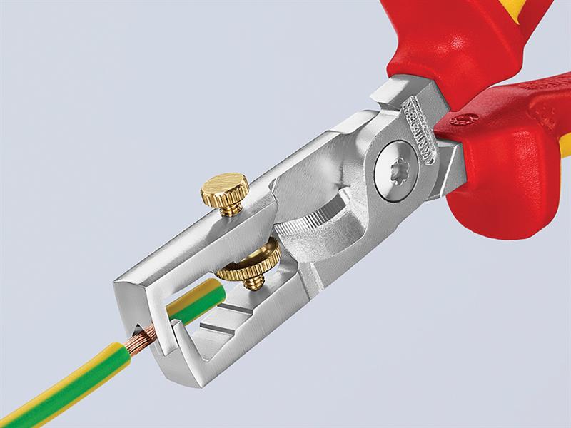 The Knipex 13-6 Series StriX Insulation Stripper with multi-component grips, VDE tested up to 10,000V and safe for work up to 1,000V. They conform to DIN EN / IEC 60900. Made from high-grade tool steel that has been forged and oil-hardened, multiple times. Chrome plated finish. The knurled screw and lock nut provide easy adjustment to the required diameter of solid or stranded wire. Also fitted with a shear blade for cutting copper cable up to 15mm (5 x 2.5mm²) and a bolted joint for precise operation with zero backlash. The pliers have a slim design for easy access.