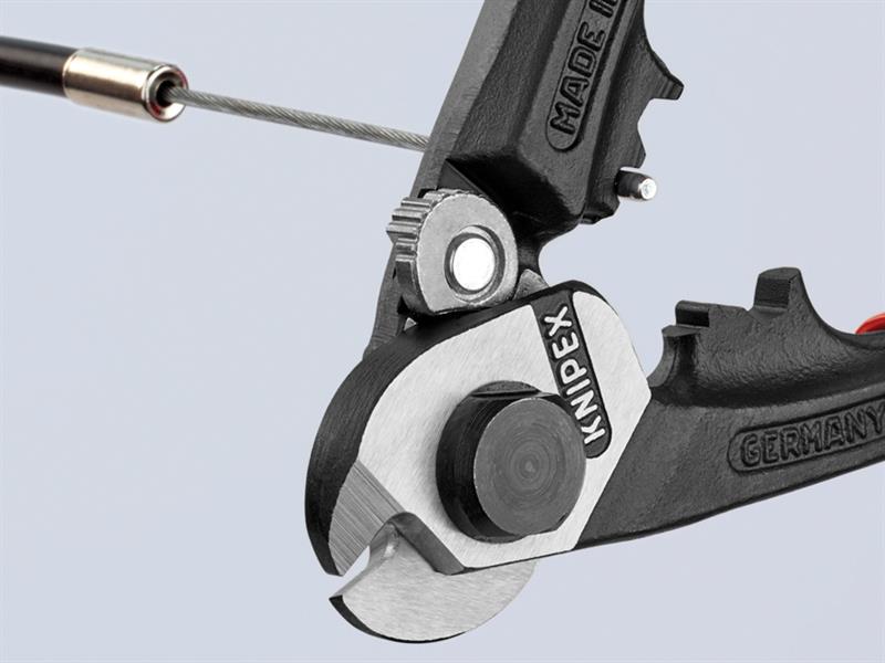 This Knipex Wire Rope/Bowden Cable Cutter plastic coated handles for added grip and comfort.