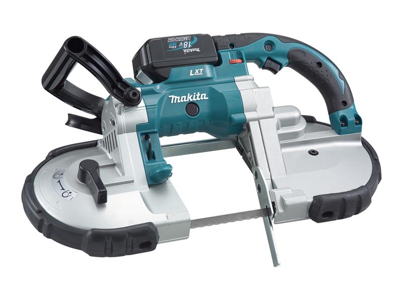 Makita DPB180 LXT Portable Band Saw for spark-free cutting of metal. This lightweight saw is easily portable, ideal for cutting pipes and fibre-reinforced hoses. A variable speed control dial enables you to match the speed to the application. Whilst the electronic current limiter provides overload protection.