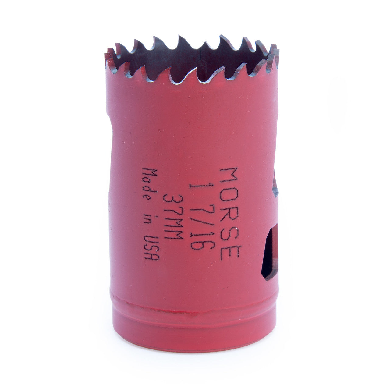 The Morse MHS23 (177238) Bi-Metal Hole Saw has a diameter 1. 7/16in - 37mm. The All-New Advanced Bi-Metal Hole Saw by Morse is their latest sawing innovation, a simple optimized powerhouse. Engineered for optimum cutting performance and longer life. The exceptional durability yields cost per cut savings over other saws. Applications in: Wood, plastic, machinable metals, stainless steel alloys, nail-embedded wood. Sold without Arbor or Pilot Drill. Compatible with Morse MA45PS (139038) 7/16in Hex Pin Arbor.