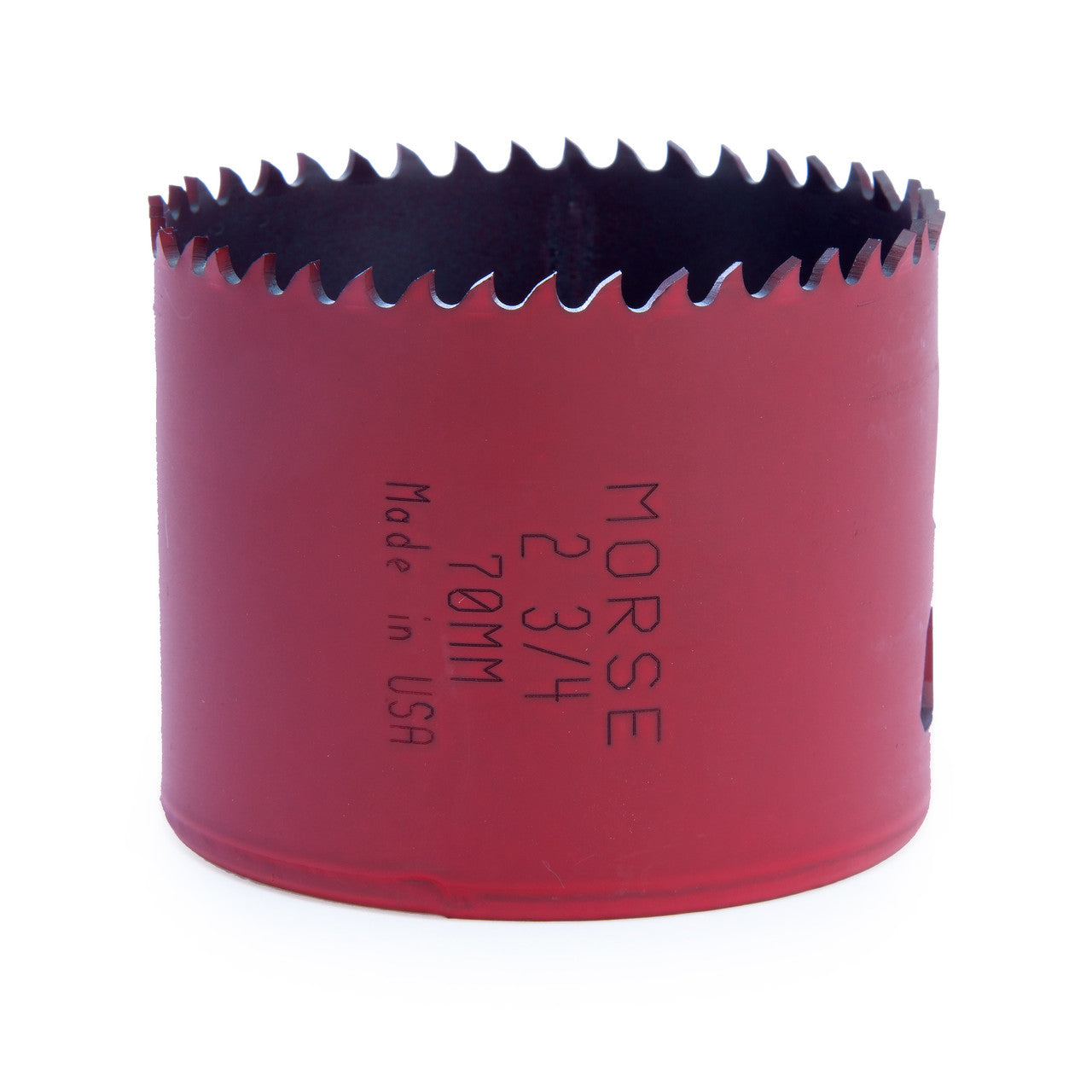 The Morse MHS44 (177443) Bi-Metal Hole Saw has a diameter 2. 3/4in - 70mm. The All-New Advanced Bi-Metal Hole Saw by Morse is their latest sawing innovation, a simple optimized powerhouse. Engineered for optimum cutting performance and longer life. The exceptional durability yields cost per cut savings over other saws. Applications in: Wood, plastic, machinable metals, stainless steel alloys, nail-embedded wood. Sold without Arbor or Pilot Drill. Compatible with Morse MA45PS (139038) 7/16in Hex Pin Arbor.