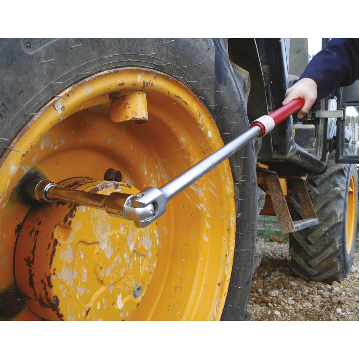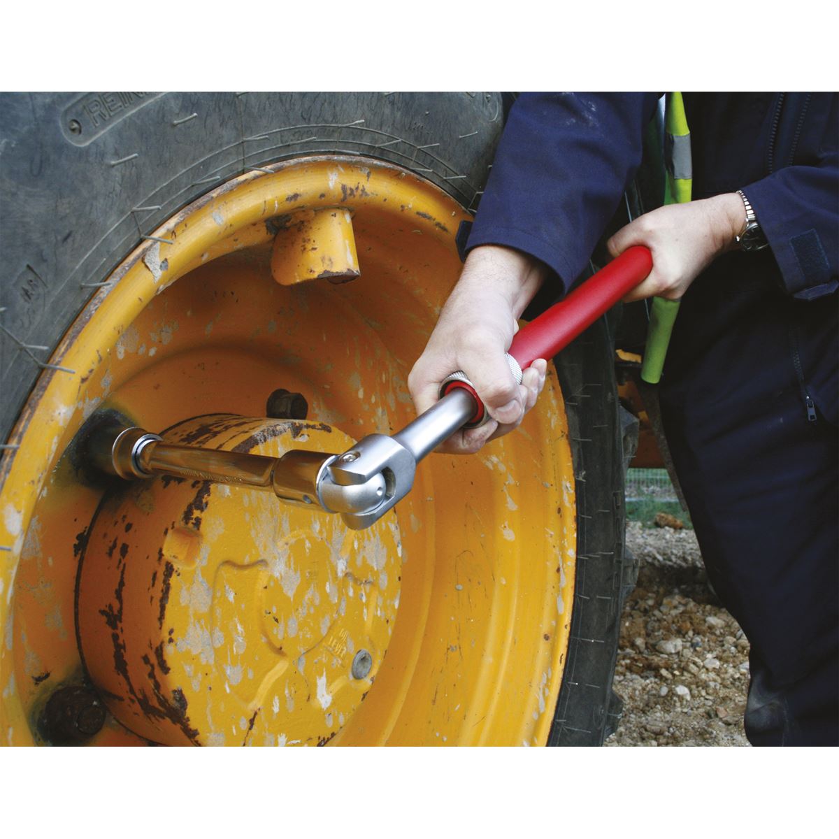 Hardened and tempered Chrome Vanadium steel breaker bar with a fully polished mirror finish. Handle extension retained at set increments with a quick release locking ring giving three different shaft lengths from 540-800mm. Spring loaded socket retention. Fully replaceable knuckle joint*.