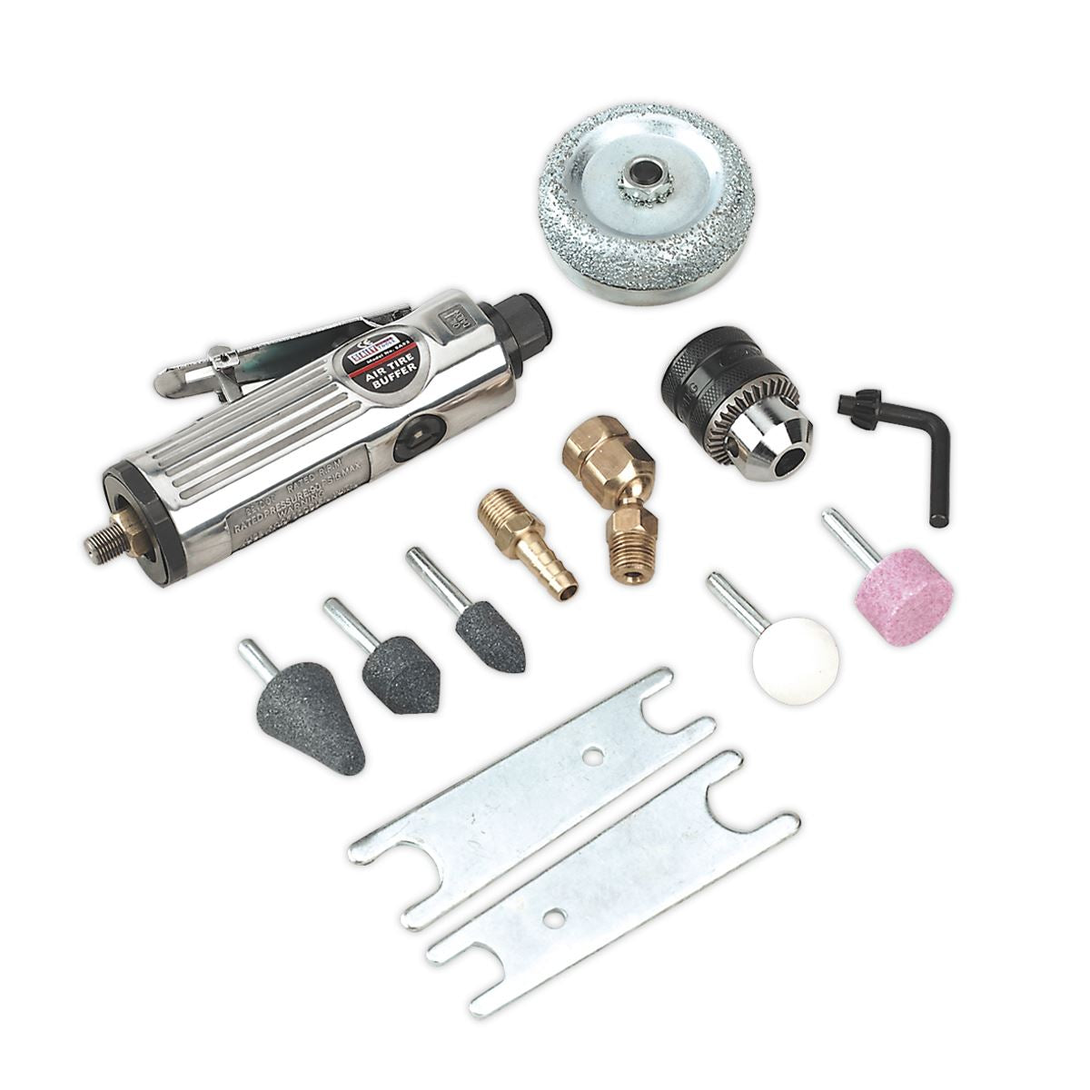 Aluminium cased air motor with selection of 6mm-shanked grinding points, 10mm chuck and tyre buffing cone.