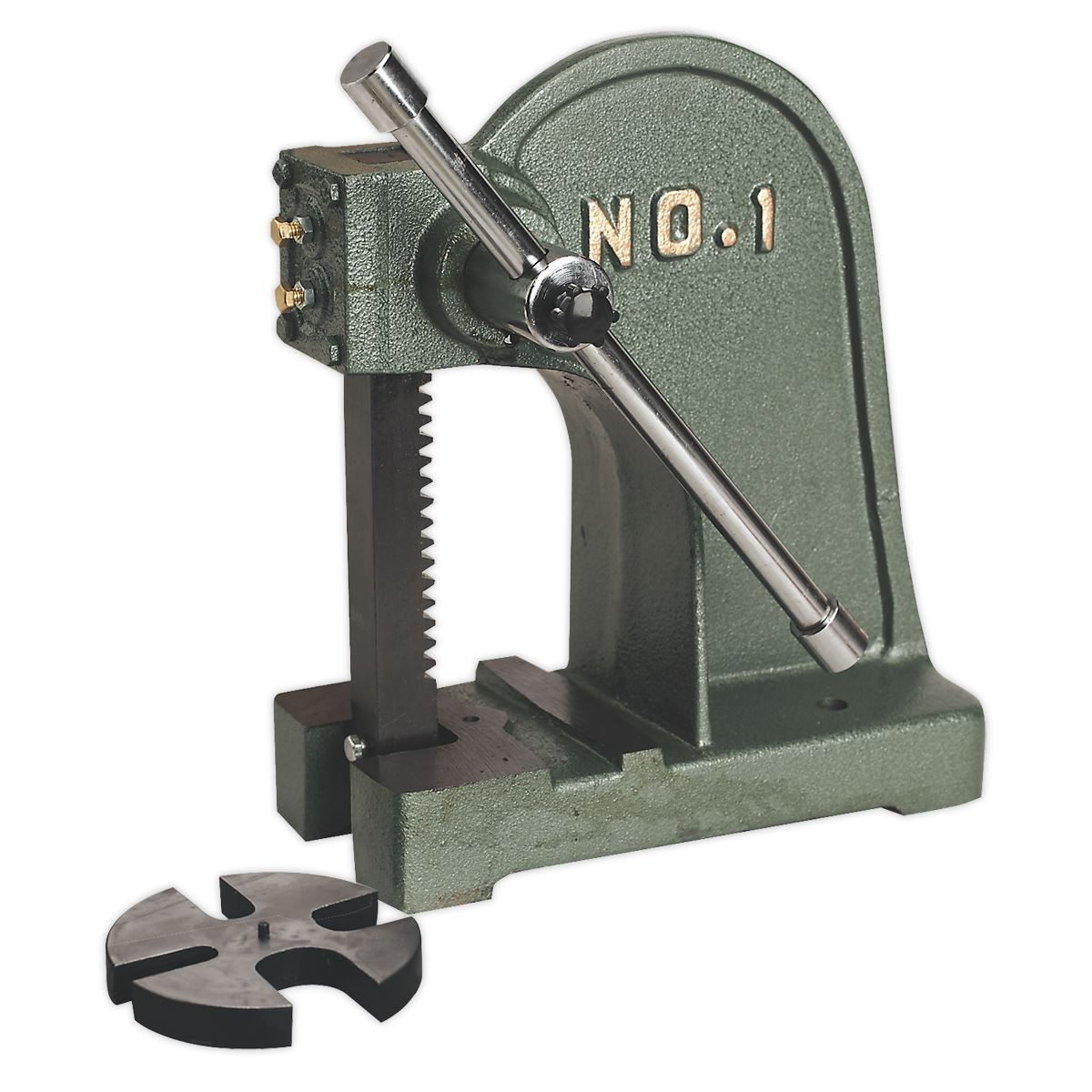 Cast steel frame with machined steel toothed arbor. 4-Position table with varying sizes of cut-outs for pressing operations. Throat Depth: 114mm. Max Table Height: 95mm. Suitable for repetitive manufacturing operations.