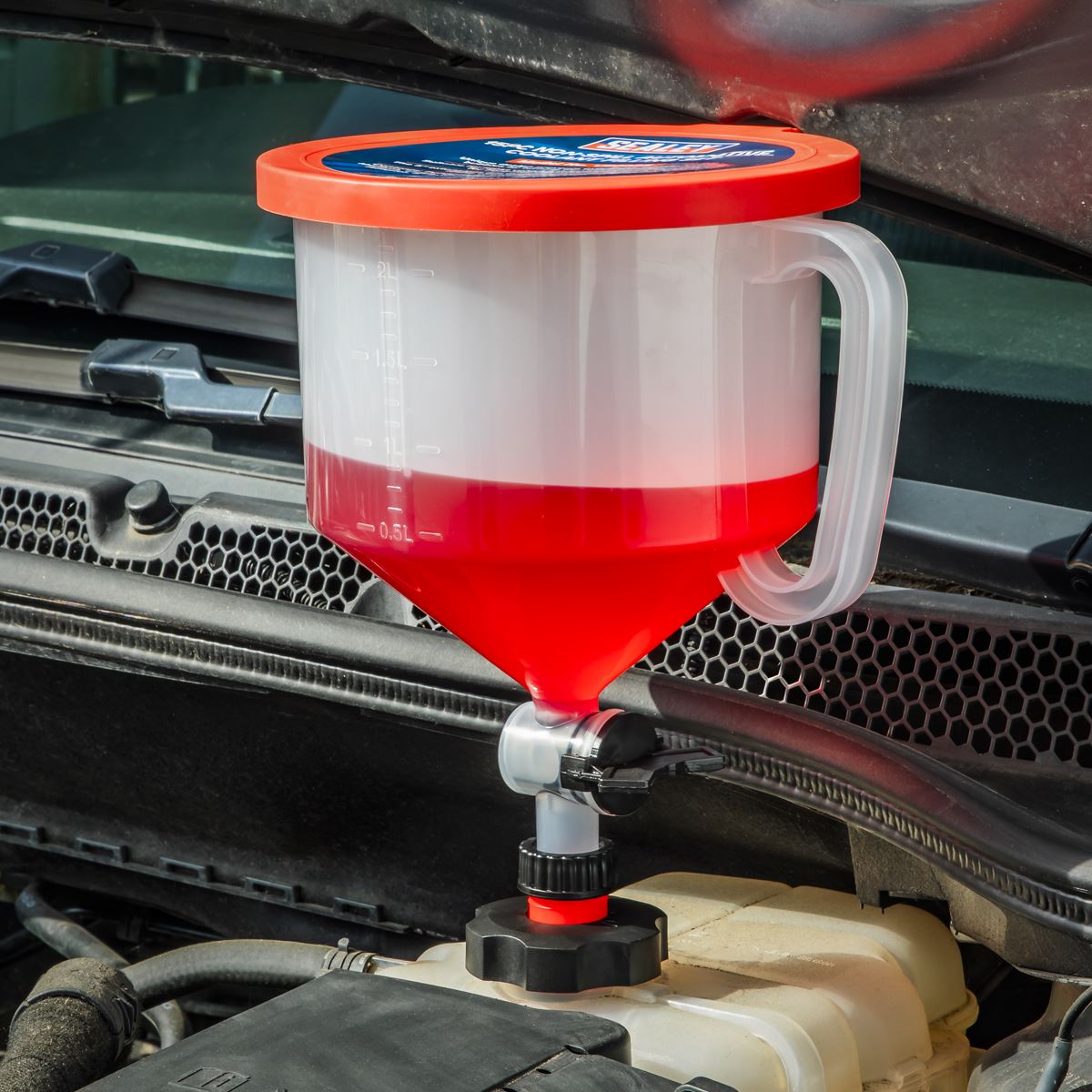Unique design prevents overfilling and air bubbles by turning the rotary switch. Suitable for most vehicles with added adaptors for Ford and GM vehicles. The 5" extensions are designed for hard-to-reach filling expansion bottles. Contents: Funnel with Switch, Lid, Caps; Small, Medium, Large, Threaded Cap, GM Adaptor, Ford Adaptor, 5" Extension (x2), 45 Elbow (x2).