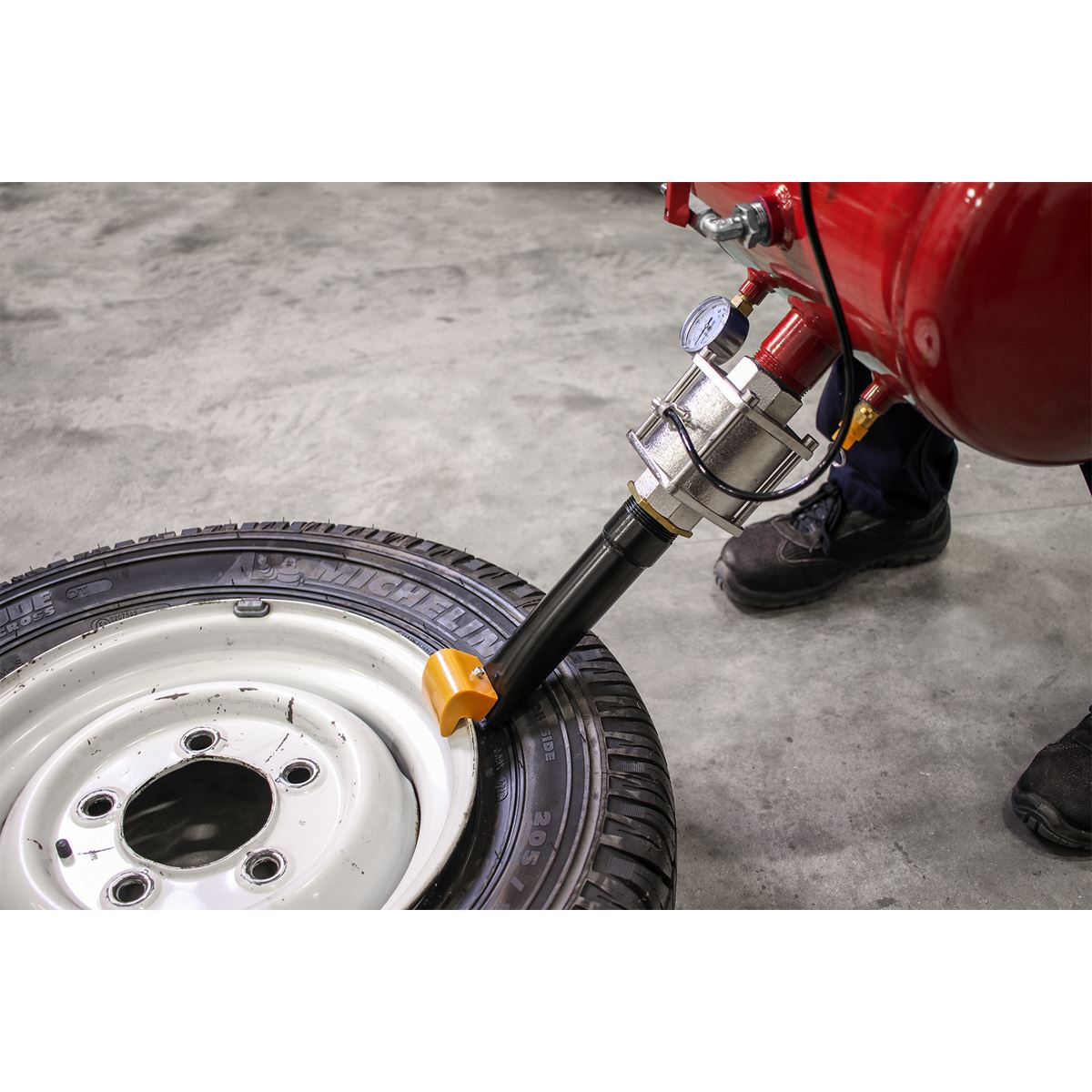 The easy and instant way to seat tubeless tyre beads. Dumps air into tyre void forcing bead to seat against rim for inflation. Air release is controlled by a diaphragm valve and push-button trigger. Features slotted key to prevent accidental operation of the trigger. Fully certified tank with gauge and safety valve prevents over pressurising. Suitable for use on cars, commercials, agricultural and ATV tyres.