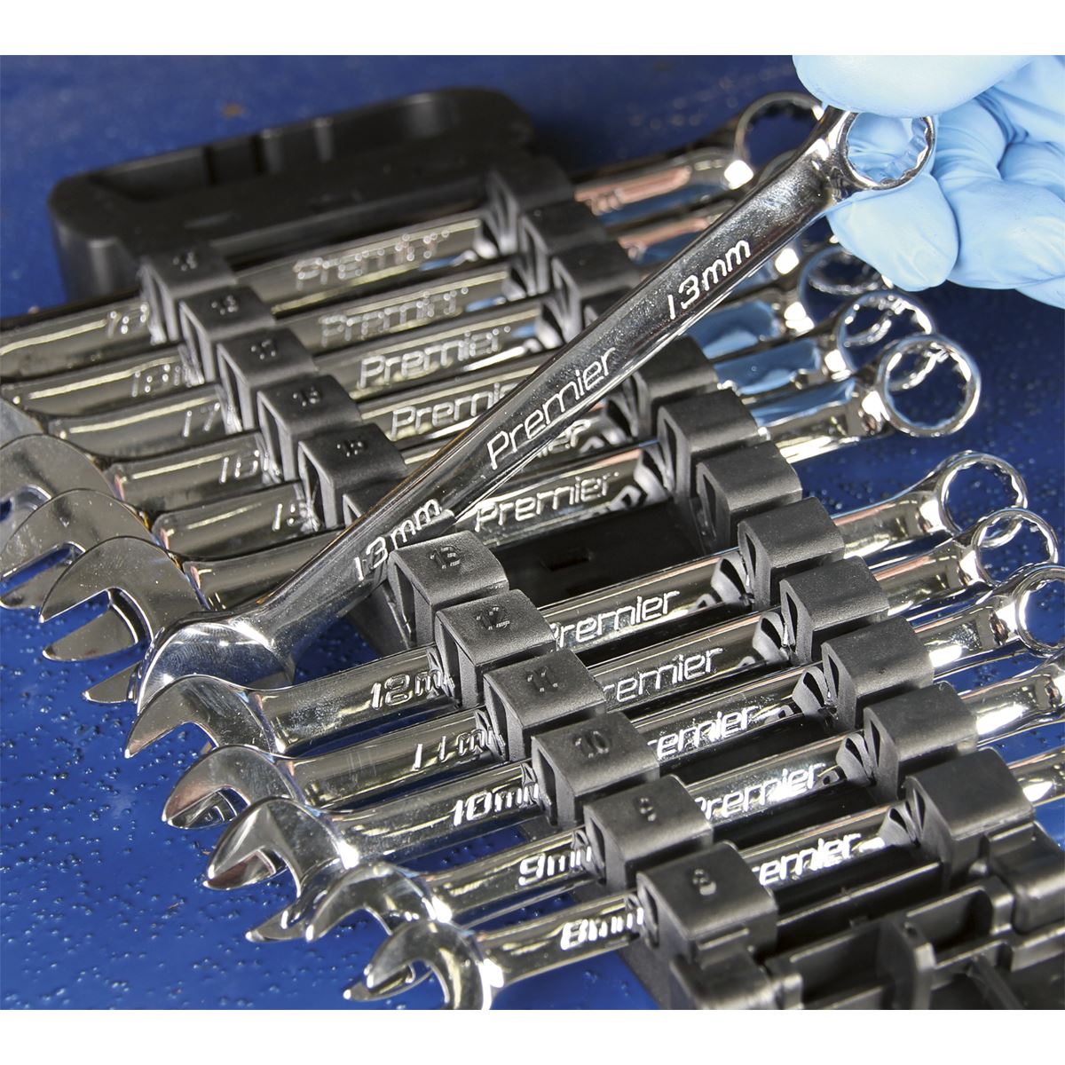 Drop-forged Chrome Vanadium steel spanners. Hardened and tempered with a fully polished, mirror finish. Open-end and WallDrive® ring combination with long slim shaft. Supplied in EVA foam storage tray.
