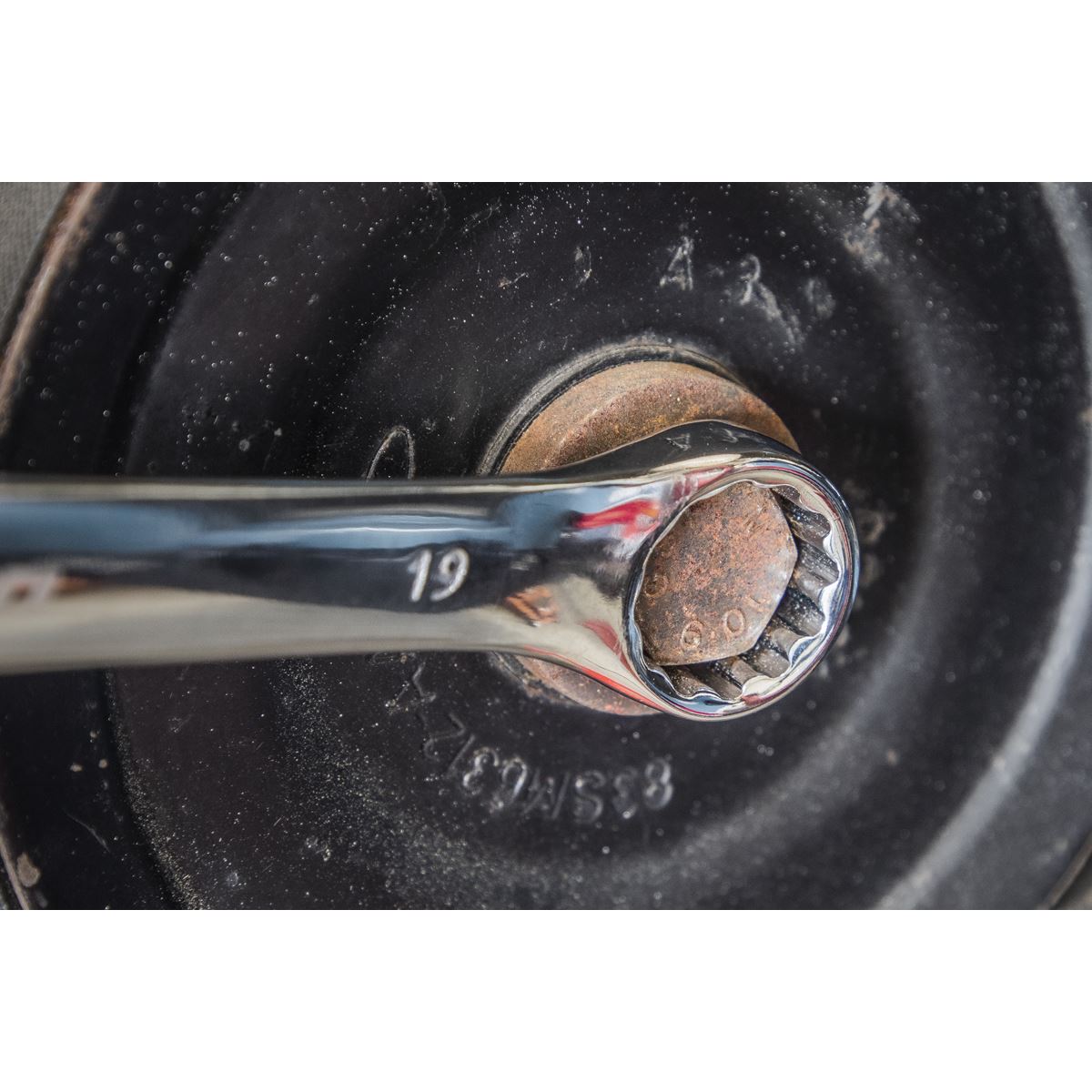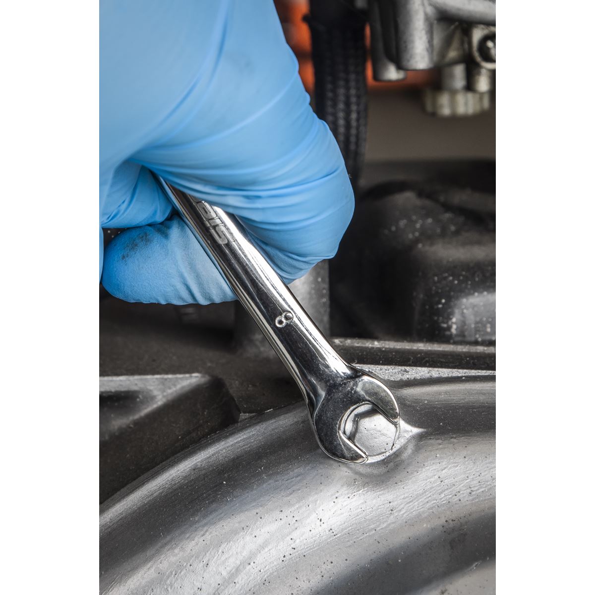 Drop-forged Chrome Vanadium steel combination spanners. Hardened, tempered and fully polished mirror finish for corrosion resistance. Open-end and 12-point WallDrive® ring combination. Supplied in storage/carry rack.