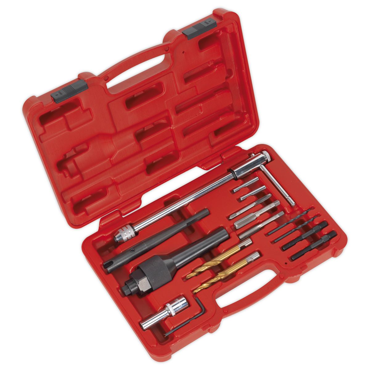 Designed to remove damaged/broken glow plugs from cylinder heads. Suitable for glow plugs with an M8 x 1mm and M10 x 1mm thread. Set includes all required adaptors for drilling, centring and pulling for the safe removal of glow plug. Supplied in storage case.