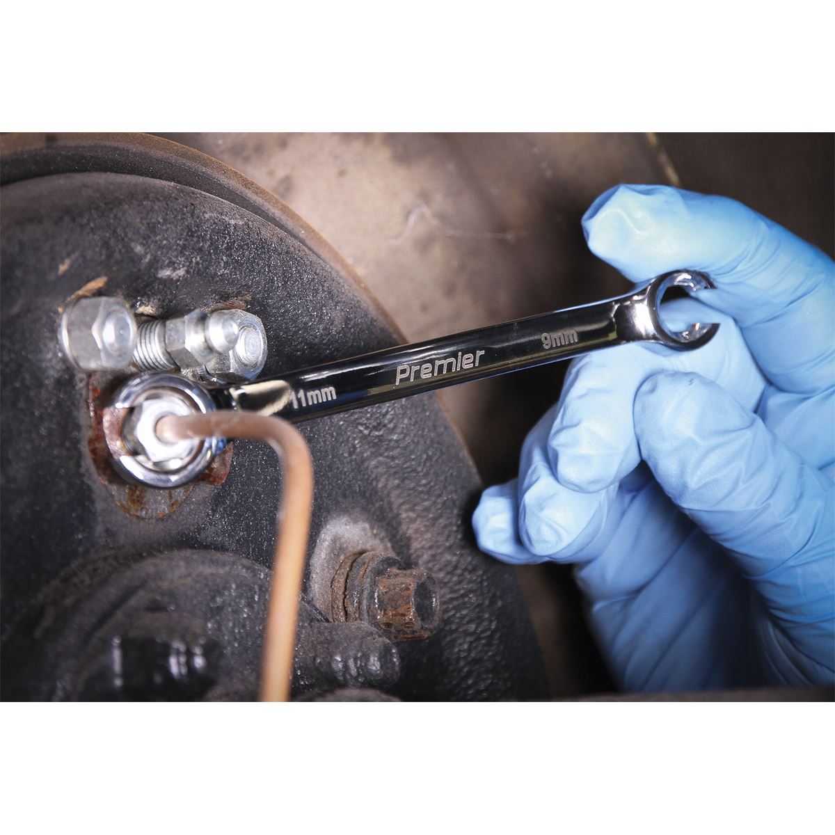 Drop-forged Chrome Vanadium steel with contoured shafts. Fully hardened, tempered and chrome plated with a polished mirror finish for resistance to corrosion. Flare type spanner jaw suitable for most common sizes of compression joint fittings. Five spanners covering ten sizes. Supplied in storage/hanging pouch.