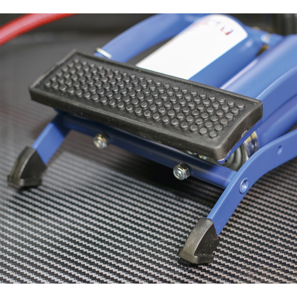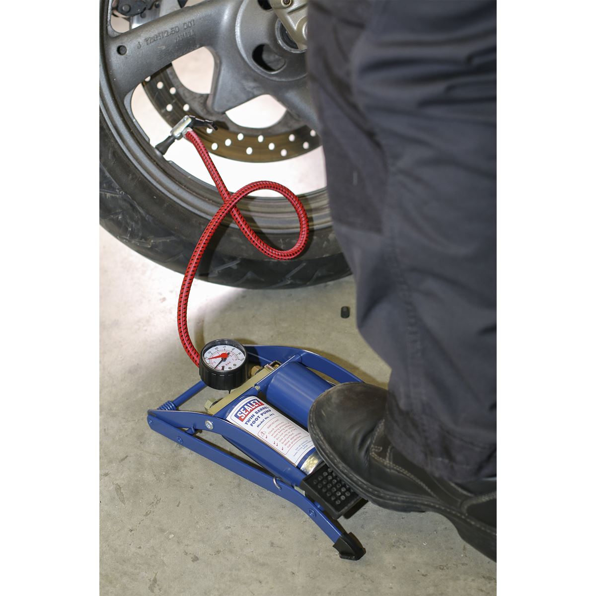 High power, steel framed foot pump with two 50 x 120mm steel barrels. Dial type pressure gauge with rotating bezel. Gauge calibrated in psi and bar and ranges from 0-100psi and 0-7bar. Fitted with 610mm flexible pressure hose with locking connector.