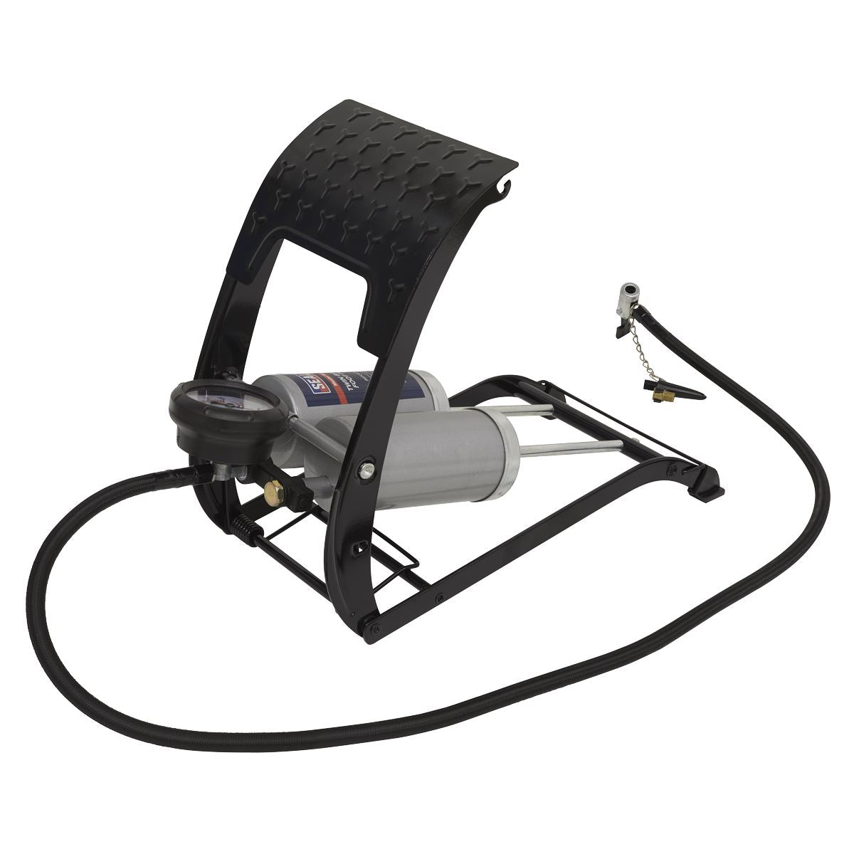Professional steel framed foot pump with two 50 x 120mm steel barrels. Features large metal pedal for easy operation and control. Easy-to-read dial type pressure gauge calibrated in psi and bar, ranges from 0-100psi and 0-7bar. Fitted with 1020mm flexible pressure hose with locking connector. Supplied with accessories for inflating items such as small inflatable boats, air beds and balls.
