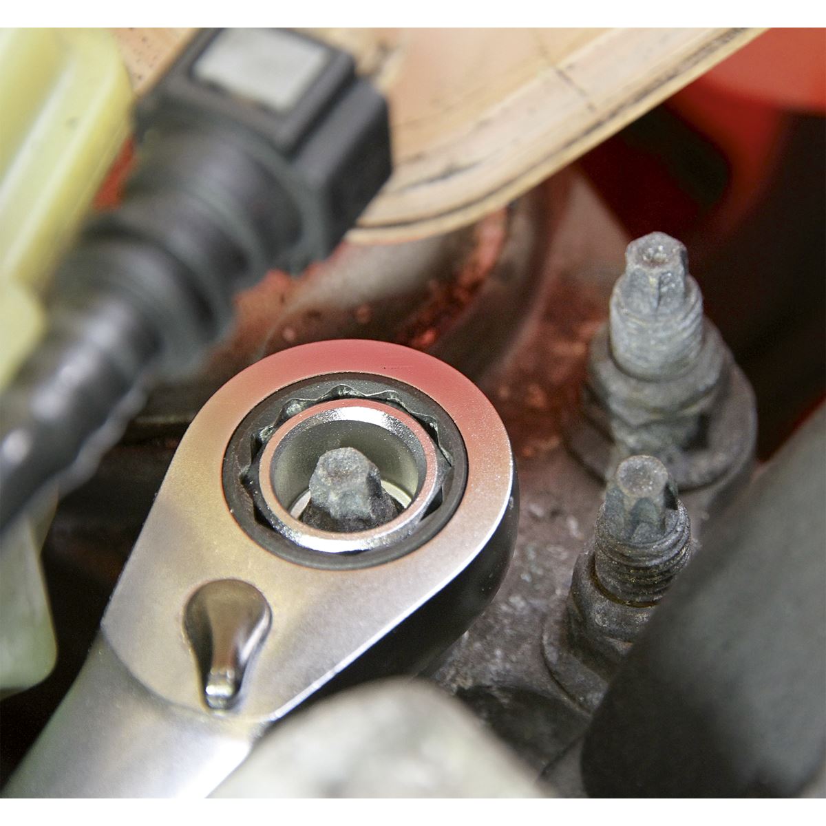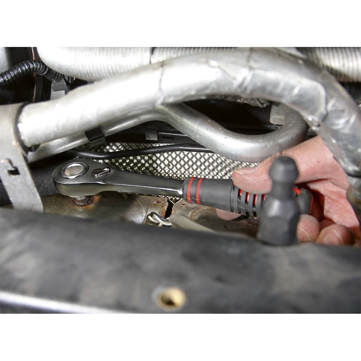 Manufactured from hardened and tempered Chrome Vanadium steel with a fully polished micro satin finish. Low profile sockets with a projected length of just 13mm, ideal for use under dashboards and on auxiliary belts as well as any other application where access is restricted. Go-through design for nuts on extended studs and adjusting screw locknuts. Sockets range from 8-19mm. Includes go-through extension. Flip reverse, 72-tooth ratchet wrench with push-through socket release. Supplied in storage case.