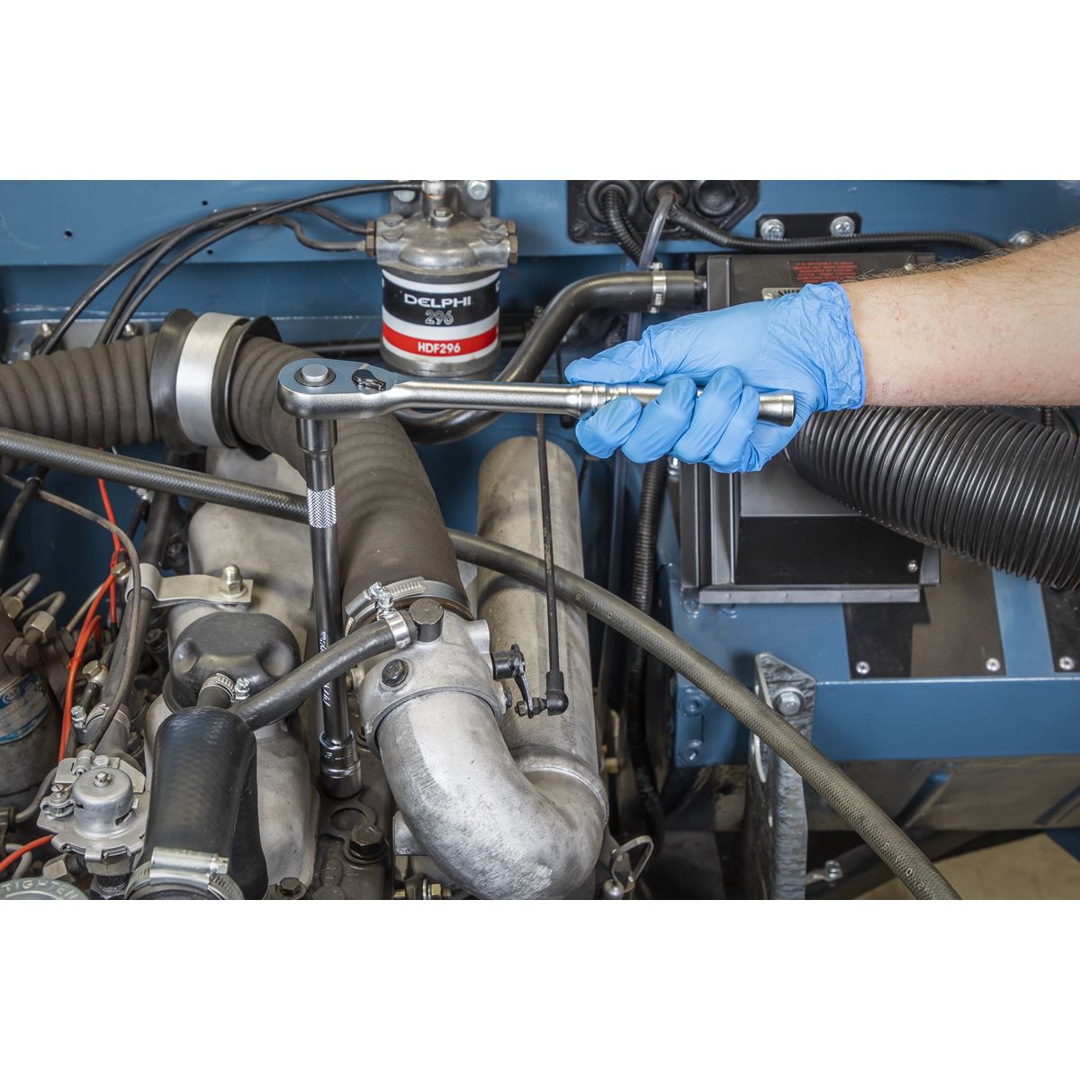 90-TOOTH RATCHET Features 90-tooth ratchet wrench with push button quick release, extension bars, universal joint and adaptors.