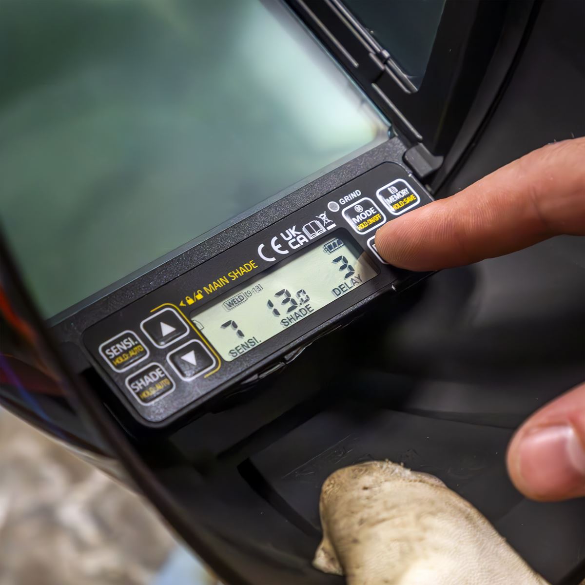 EXTERNAL CONTROLS FOR FAST SWITCHING DURING WELDING - Externally, the helmet also features rotating switch and mode selector to easily switch between welding and grinding settings whilst adjusting shade without removing the mask.