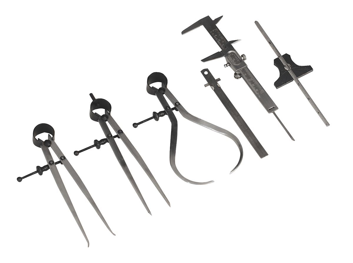 Contains: Vernier Calipers, Depth/Angle Gauge, External Calipers, Dividers, Internal Calipers, Pocket Rule with Clip.
