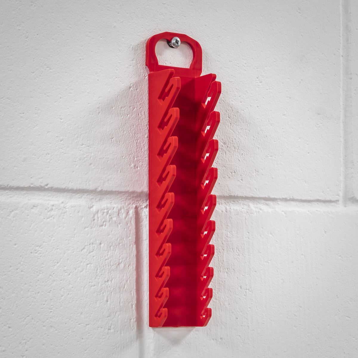 Soft, non-marking TPR material spanner rack helps maintain an organised toolbox or workstation. Securely holds up to 10 spanners for easy size identification. Can also be carried or wall mounted. Solvent and fuel resistant.