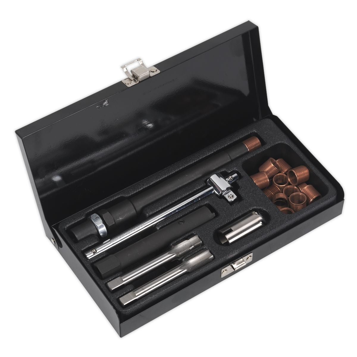 Comprehensive and time-saving kit of spark plug thread repair tools. Especially suitable for the repair of deep-seated plug configurations. Incorporates taper and plug taps together with integrated ream. Stepped tap ensures correct alignment of cutter in existing spark plug hole. Extension tools allow easy-access to the bottom of the plug recess. Includes set of plug inserts.