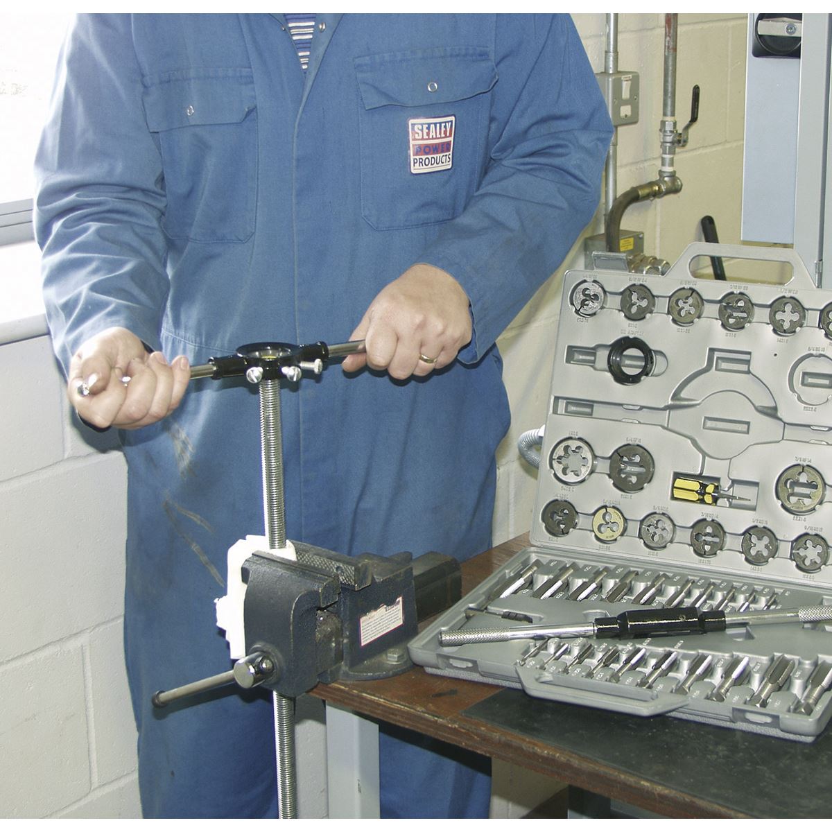 Precision machined, Tungsten steel taps and dies. Dies are split to facilitate the fine adjustment of core diameter. Set includes Metric coarse and fine sizes, sliding jaw type tap wrench and T-Bar type tap wrench together with steel die holder with knurled screws. Supplied in storage case.
