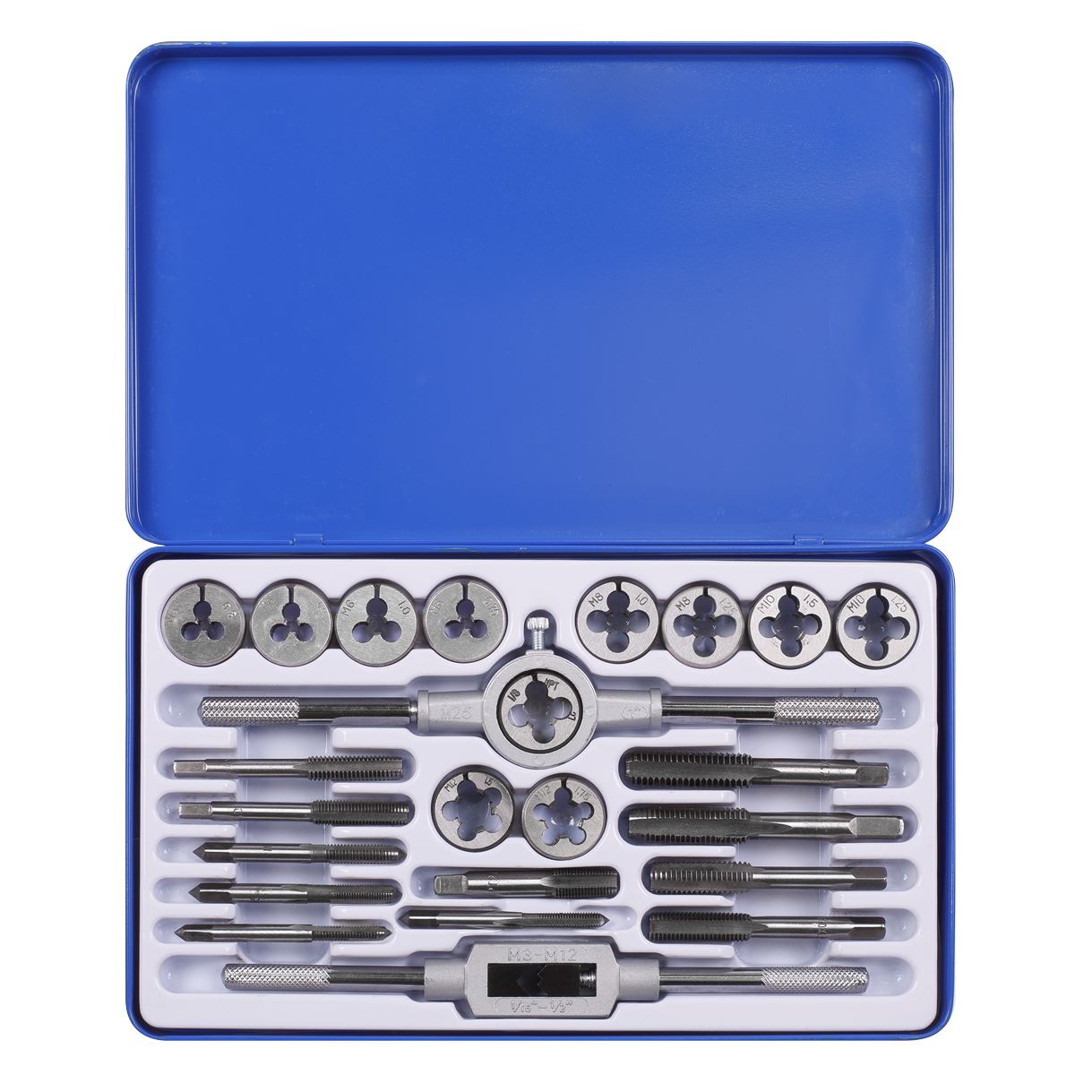 Contents: Taps and Dies in following sizes; 1/4"-20, 1/4"-28, 5/16"-18, 5/16"-24, 3/8"-16, 3/8"-24, 7/16"-14, 7/16"-20, 1/2"-13, 1/2"-20, 1/8"-27 and double-ended tap wrench and die holder with retention screw.