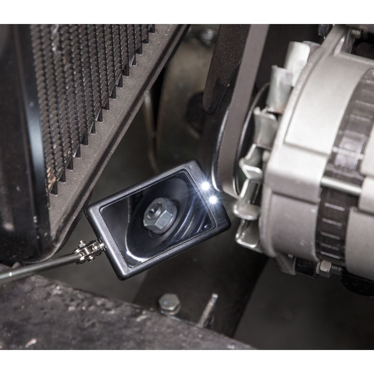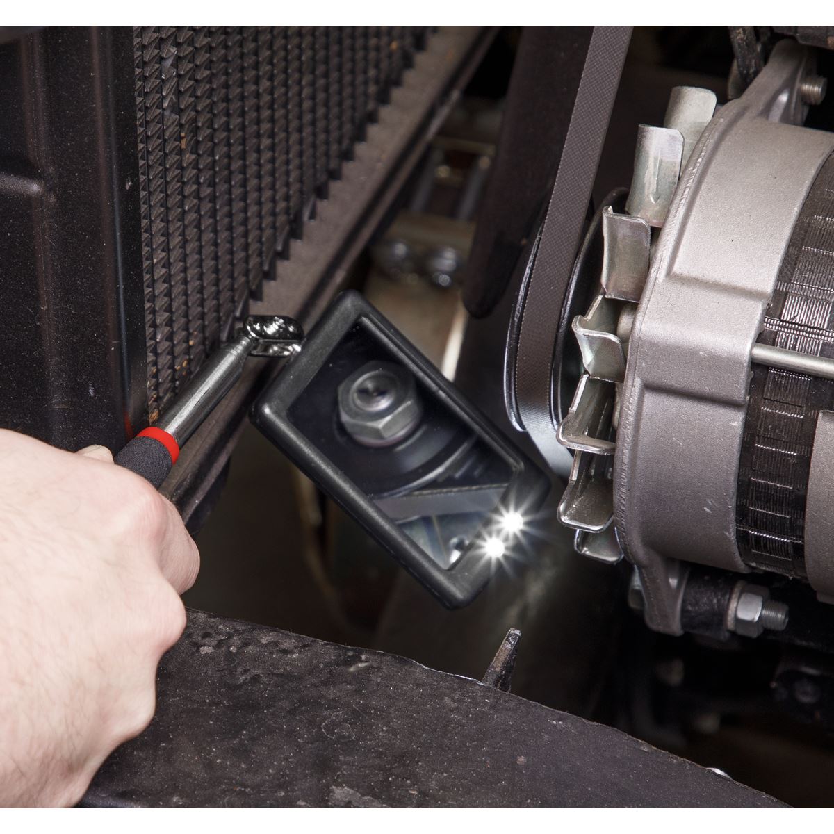 5-Section stainless steel inspection tool. 52 x 83mm Mirror with built-in LEDs mounted on twin ball joints for maximum articulation. Ideal for use in low light areas. Contoured and textured comfort grip handle. Supplied with batteries.
