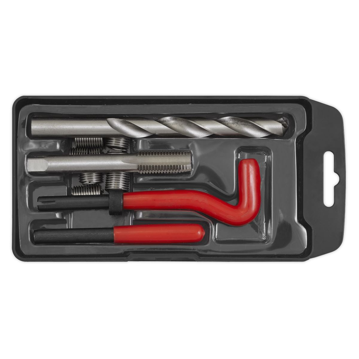 Creates a stronger internal thread in soft metals. Ideal for repairing damaged or stripped internal threads. Protects tapped threads against wear and damage. Set includes drill bit, thread tap, insert installation and lug breaking tool. Supplied with three different lengths of thread insert. Supplied in storage case.