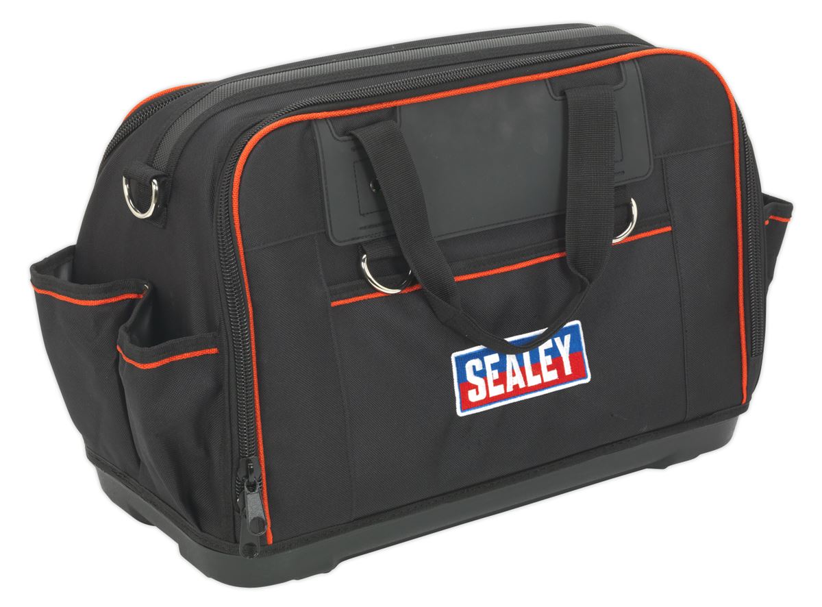 Heavy-duty tool bag constructed from tough polyester with a rigid waterproof rubber base for added durability. Keeps tools clean, dry and organised at home or on site. Two storage compartments feature a total of 15 internal pockets, an aerosol can holder and hook-and-loop retaining strap. External features include an adjustable padded shoulder strap, rubber grip hook-and-loop carry handles, four hanging D-rings and nine pockets.