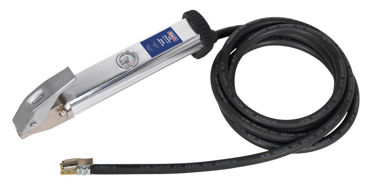 Heavy-duty extruded aluminium body and zinc head. Linear pressure scale, read in psi and bar. Has 2.7m hose with clip-on air connector for compliance with safety regulations relating to inflation of commercial and agricultural vehicle tyres.