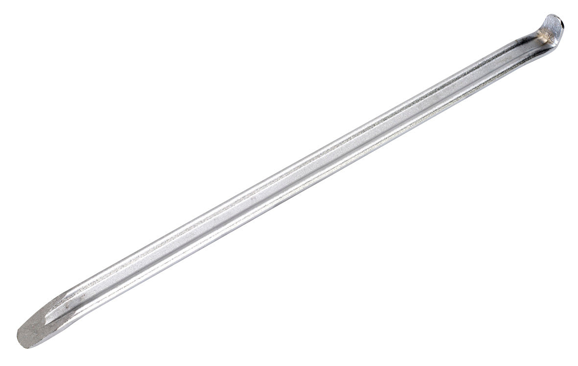 Hardened carbon steel tyre lever, with hook and taper ends.