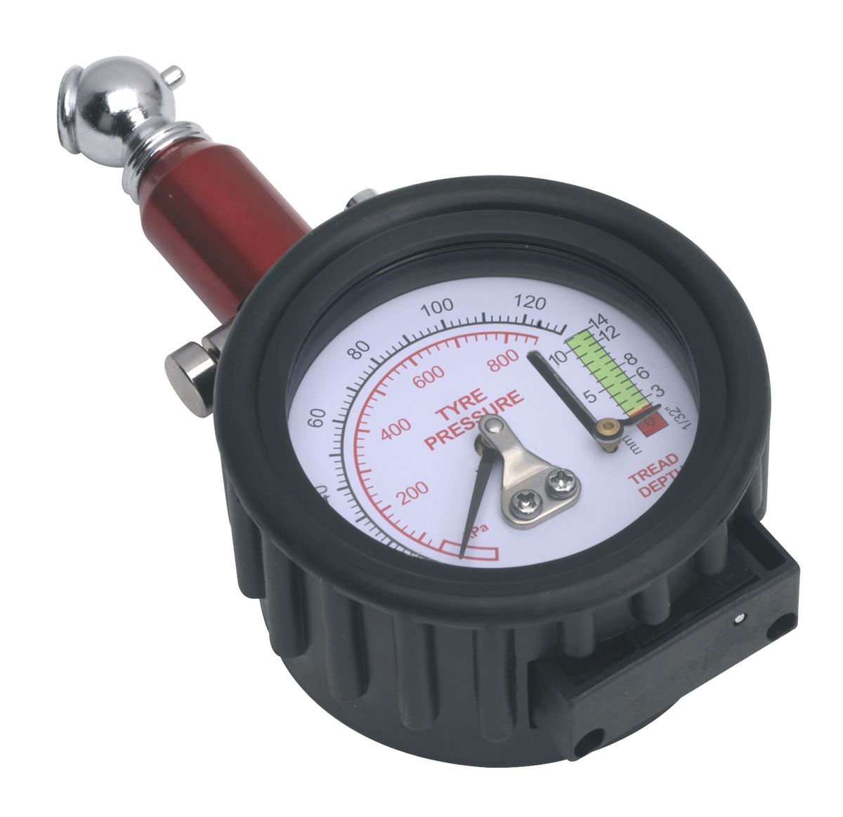 Robust gauge with protective rubber bumper reading up to 8bar(120psi). Fitted with 45 angle chuck and pressure release button. Integral colour-coded tyre depth gauge.