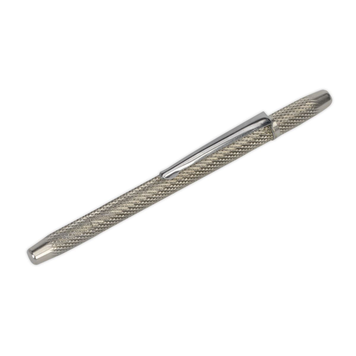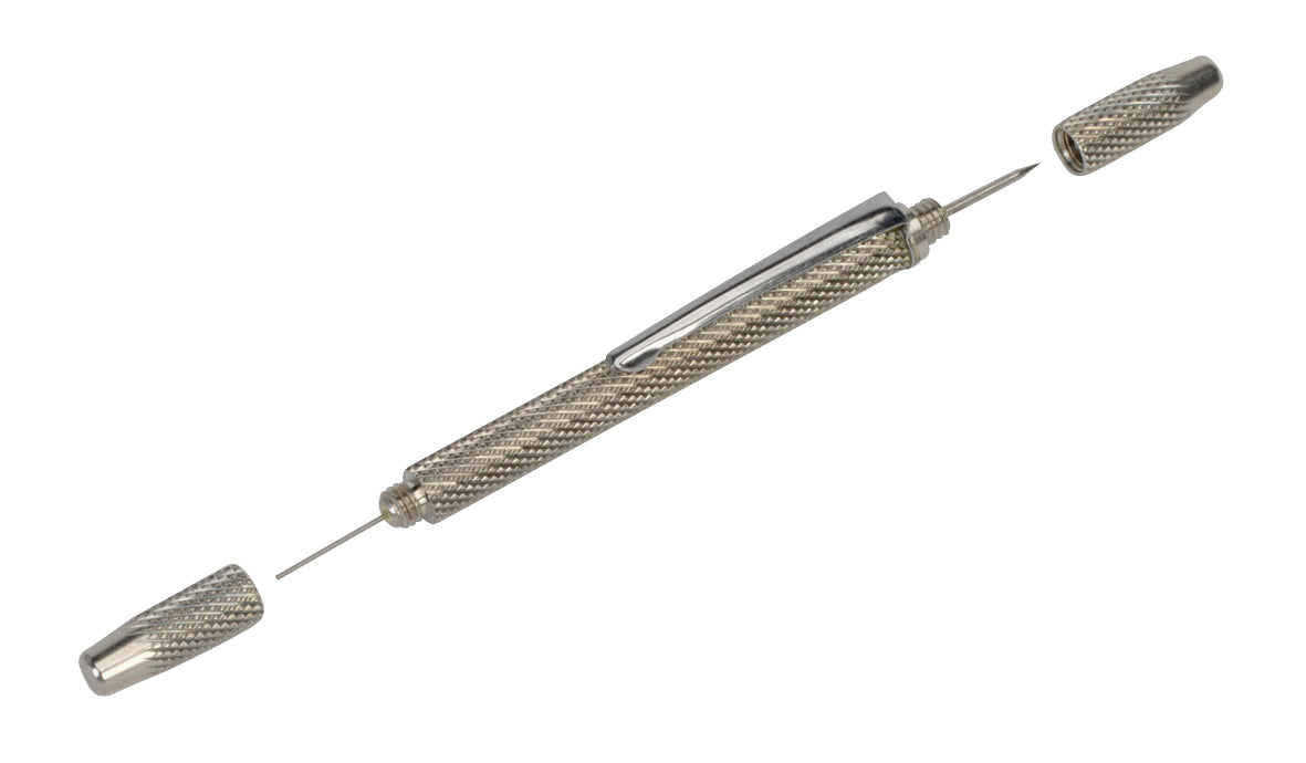 Compact, double end tool with pocket-clip. Screwed caps house a pointed scribe for cleaning and clearing washer jets at one end and finer probe for adjusting position of jets at the other. Heavily knurled body for sure handling.