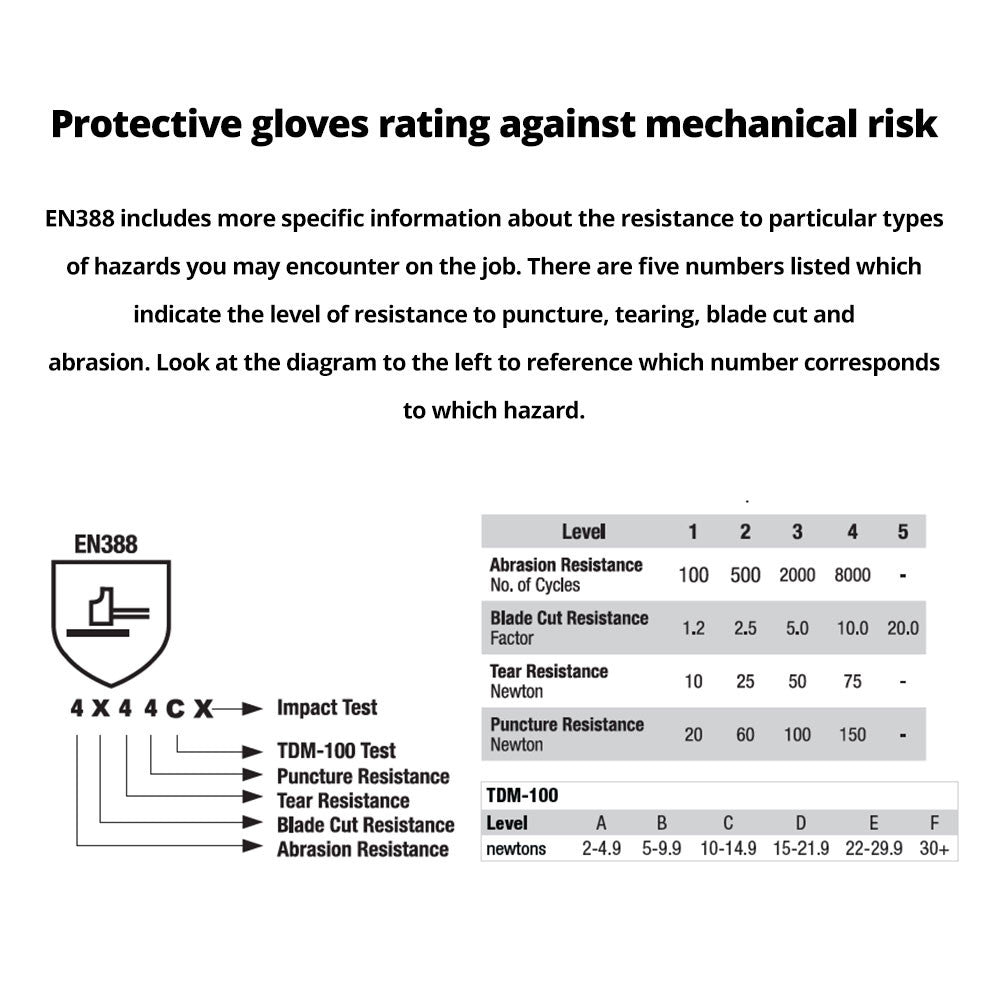 - EN 388 Certified: Meets European safety standards for abrasion resistance (3), tear resistance (1), cut resistance (4), and puncture resistance (1), ensuring a baseline level of protection for your hands