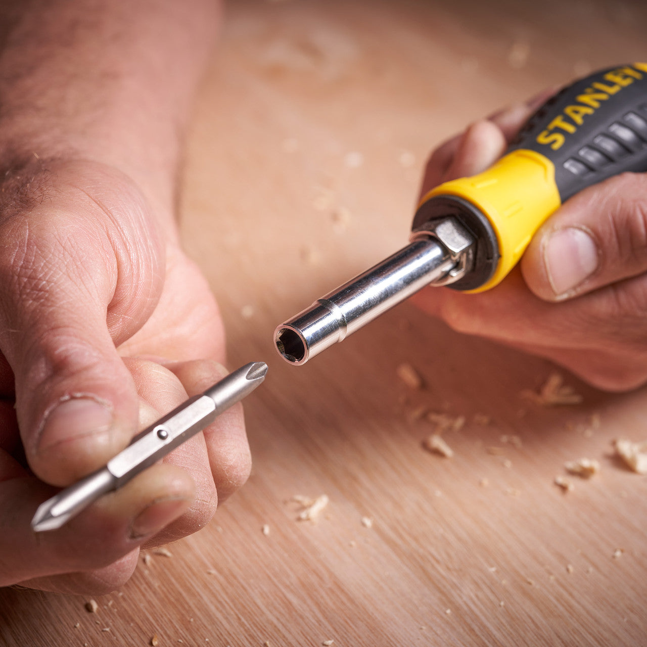 The Stanley 0-68-012 Screwdriver is a great space-saving piece of design. It has two double-ended bits one with Phillips PH1 and PH2, the other with Slotted 3/16" and 1/4". The shaft of the screwdriver has 2 Hex Drives at each end in 6mm and 8mm.