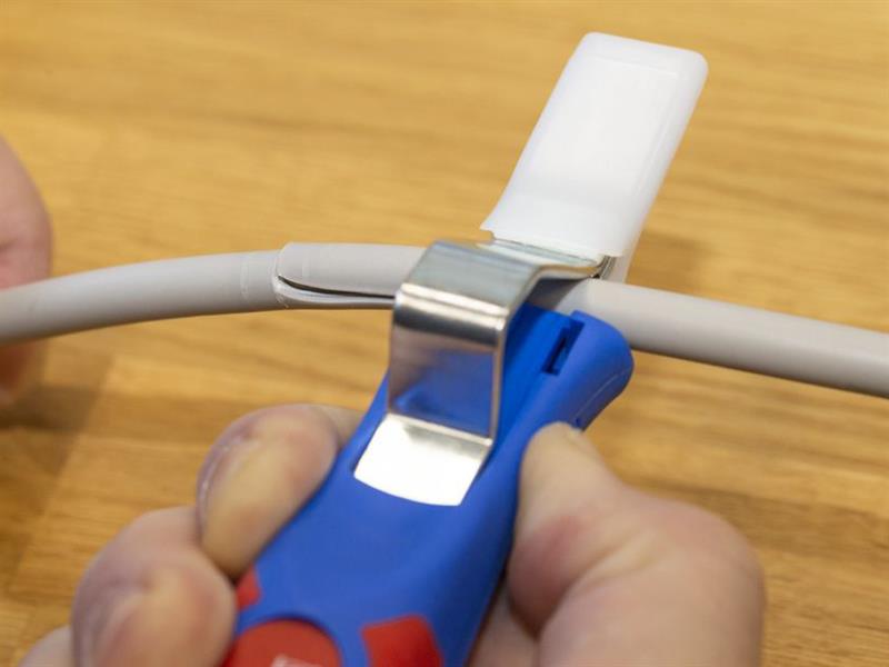 The Weicon® No. 4-28 H Cable Stripper enables precise, fast and safe stripping of all common round cables with a diameter between 4 and 28 millimetres. Fitted with an ergonomic, non-slip, multicomponent handle. The cutting blade is integrated in the housing and self-rotating, enabling the automatic adjustment from circular to longitudinal cutting. Thanks to the set screw on the back of the handle, the cutting depth can be adjusted with an infinitely variable range. This prevents damaging the inner conductor. In addition, the 4-28 H has a hook blade, which can be covered with a safety cap. The cap locks the blade safely, which significantly reduces the risk of injury.